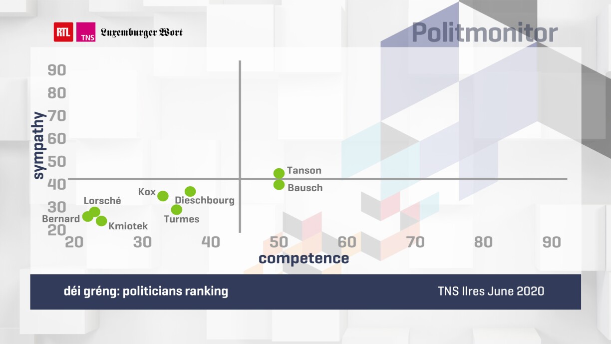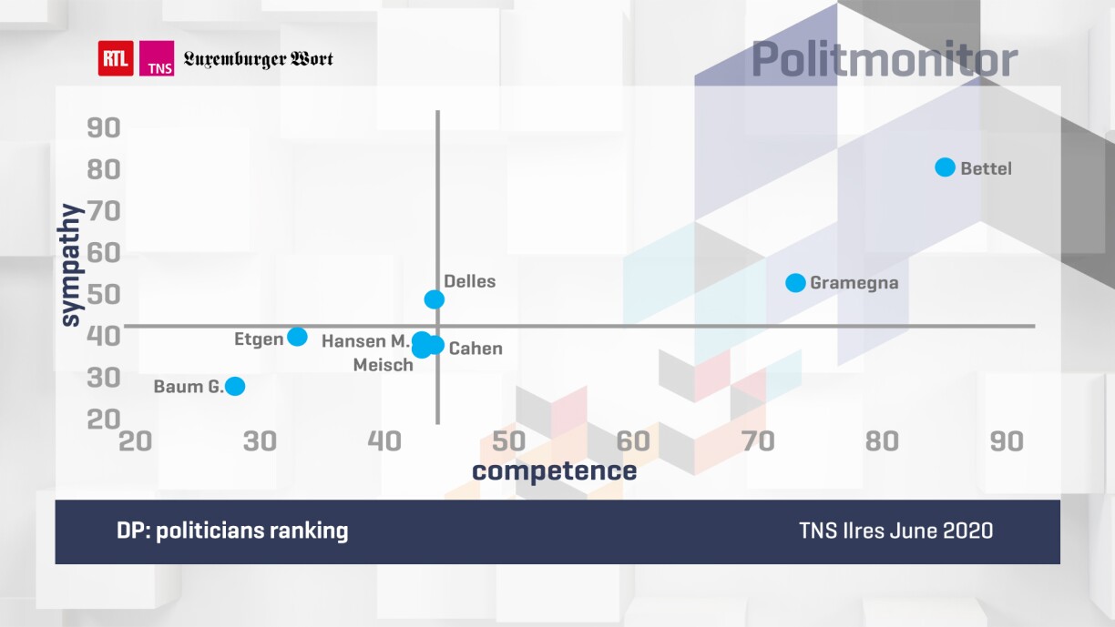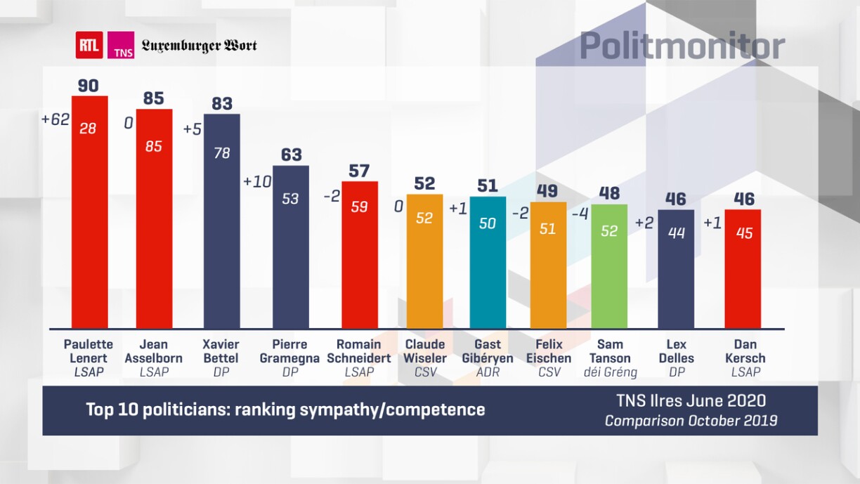 Her LSAP colleague, Minister of Foreign Affairs Jean Asselborn, remains above average with 85 points, but had to give up the top spot for the first time in seven years. Prime Minister Xavier Bettel of DP scored more points than previously, but remains in third place with 83 points. The survey marks him as more competent (85 points) than sympathetic (81 points).