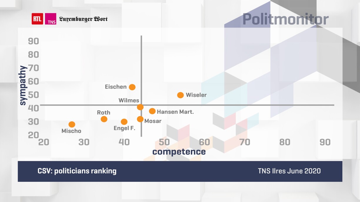 CSV, the biggest opposition party, noted the biggest win in form of deputy Claude Wiseler. The front-runner ranked 6th with 50 sympathy points and 54 for competence. Deputy Felix Eischen, who surprised with a solid score in October, remains in 8th place, but suffered a 2 point drop. Martine Hansen lost 3 points, leaving her with 43 in total, which is still more than CSV party president Frank Engel.