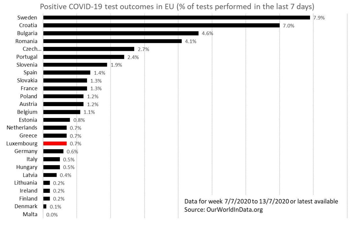In fact, with less than 1% of tests yielding a positive result at the moment, Luxembourg is in the lower range of the EU.