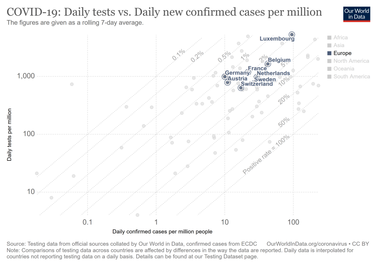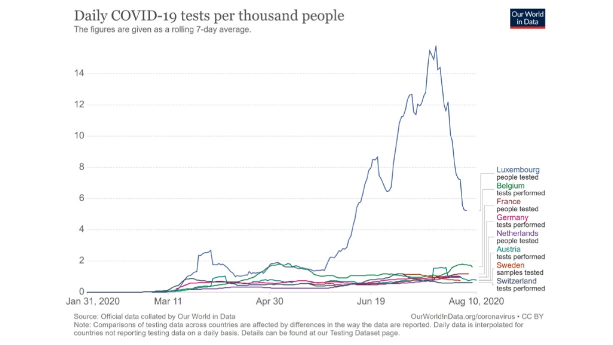 The Grand Duchy has the highest testing rate in Europe by far. In the week of 20 July, Luxembourg carried out 10,659 tests per 100,000 inhabitants - 5.7 times more than the country in second place.