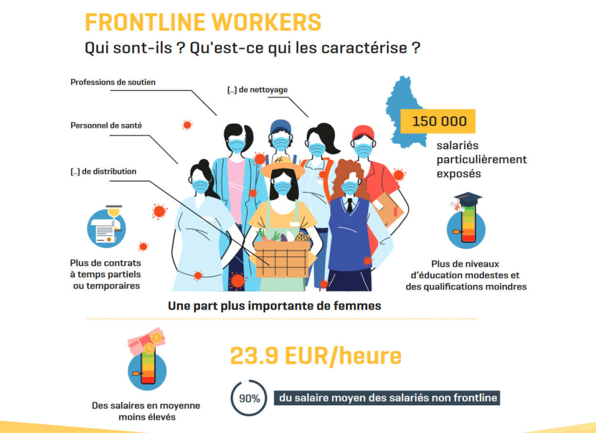 The report also analyses the situation of so-called frontline workers, meaning those people whose efforts have been considered indispensable since the beginning of the outbreak. A total of 150,000 employees are distributed over the health sector, cleaning services, and logistics. On average, they make €23.90 per hour, which equals 90% of the average salary awarded to non-essential workers during the same period of time.