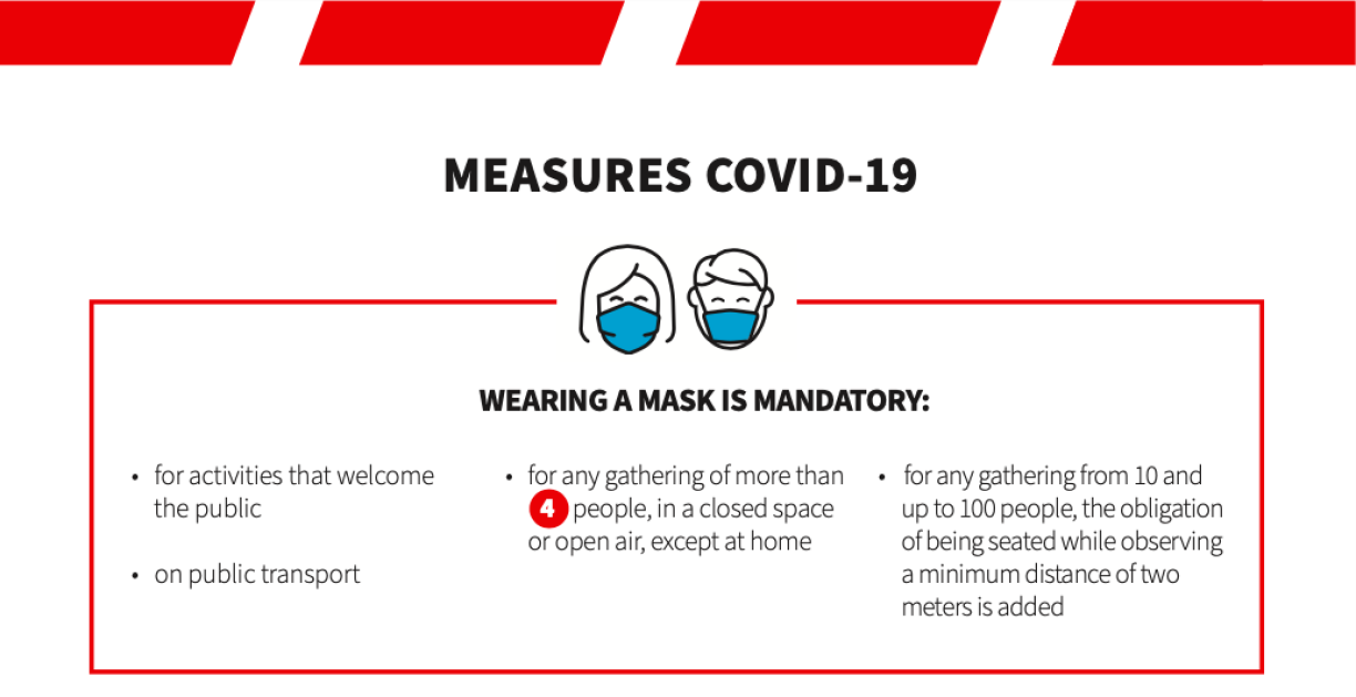 A further rule in this regard: masks are obligatory at any gathering with more than four people, whether indoors or outdoors, except at home.