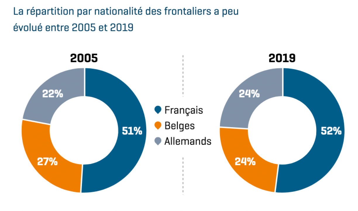 A little more than half of Luxembourg’s cross-border workers come from France, a number that remained stable at 52% between 2005 and 2019. Germany registered a 2% increase over that same period, Belgium a 3% decrease.
