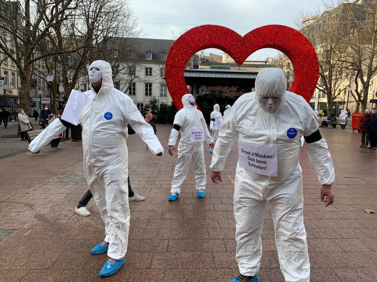 Dressed in full protective gear and carrying statements such as ‘let yourself be vaccinated’ and ‘cash makes you sick’, the demonstrators filed through Place Guillaume II in the capital.