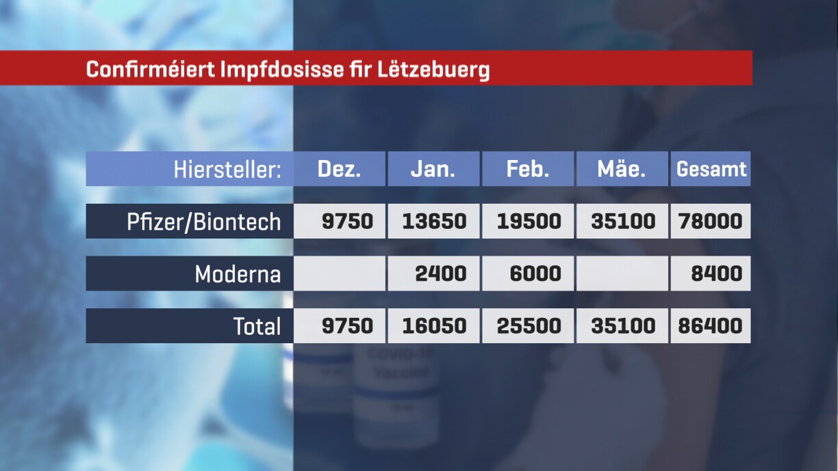 Luxembourg will receive 16,000 doses in January, 25,500 in February and 35,100 in March. Up until the end of March, 43,200 people in the country will be able to get the two-jab vaccine. While these figures derive from agreements made with the European Commission, they remain theoretical until all producers are given authorisation by the EMA.