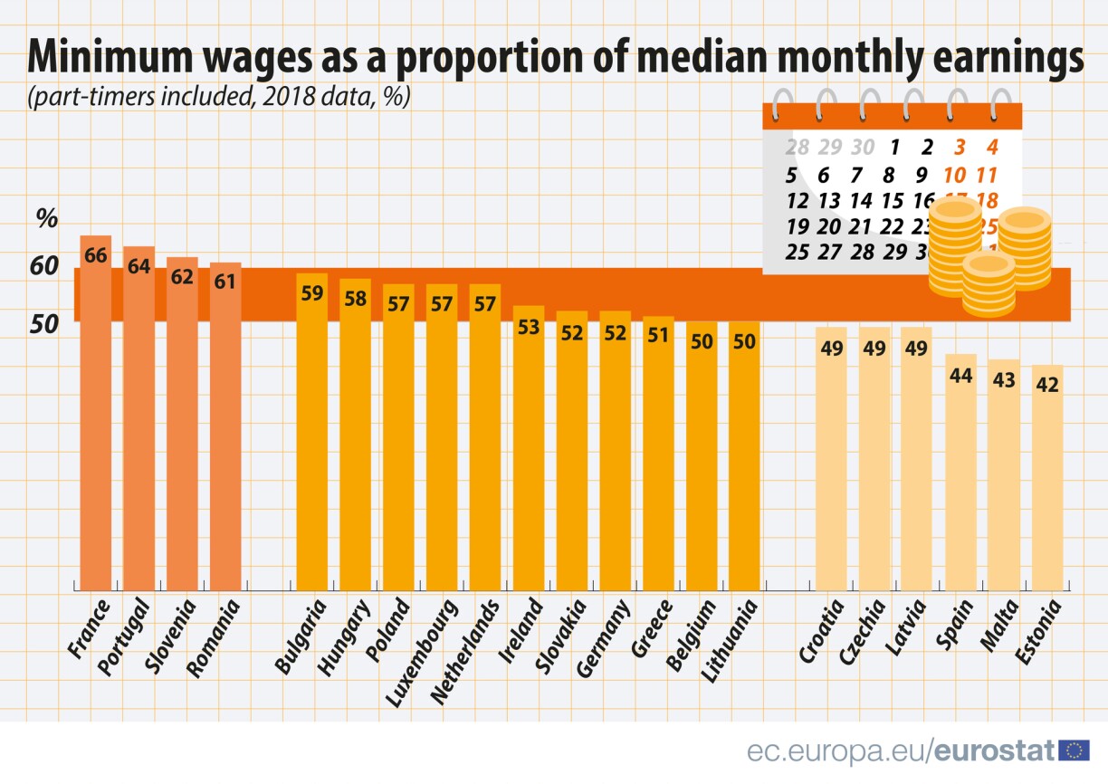 Looking at minimum wages in relative terms, by looking at how each country’s minimum wage measures up against the median gross income earned by full-time and full-time equivalent employment, the difference between the countries with higher and lower minimum wages shrinks considerably.