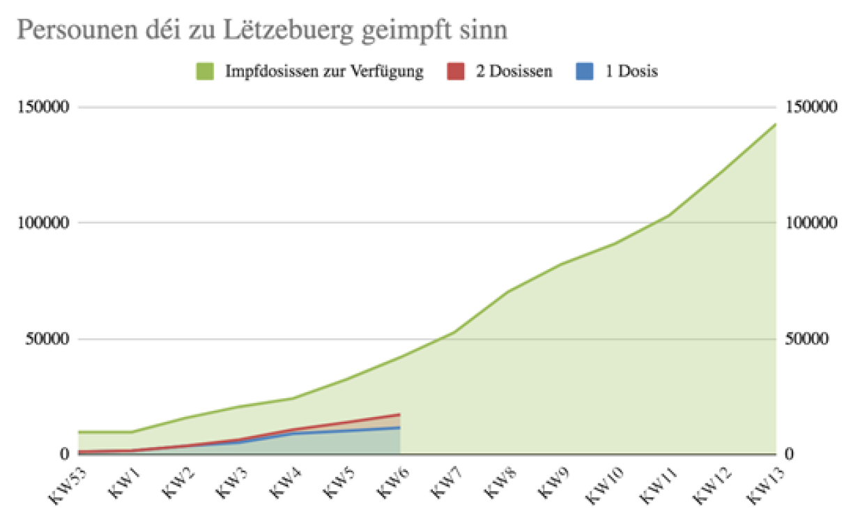 The first 9,750 doses of the BioNTech/Pfizer vaccine arrived in Luxembourg in December. On 16 February, 25,918 jabs had been administered - 19,622 of them received a first vaccine, 6,296 a second. This week, however, Luxembourg has 52,650 vaccines in stock, allowing 26,325 people to be vaccinated.