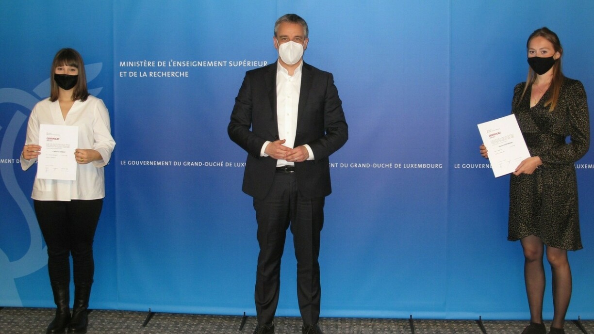Rachel Hoffmann, Georgina Henry (missing from the photo) and Catherine Arend were awarded the Auguste van Werveke-Hanno scholarship on Friday. The ceremony was held at the Ministry of Higher Education in the presence of Minister Claude Meisch.