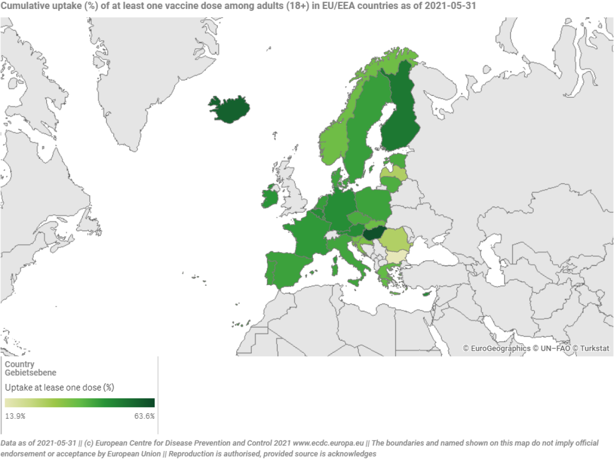 According to the latest data, 44.1% of all EU adults above the age of 18 have received at least one jab. In Luxembourg that figure is 44.2%.