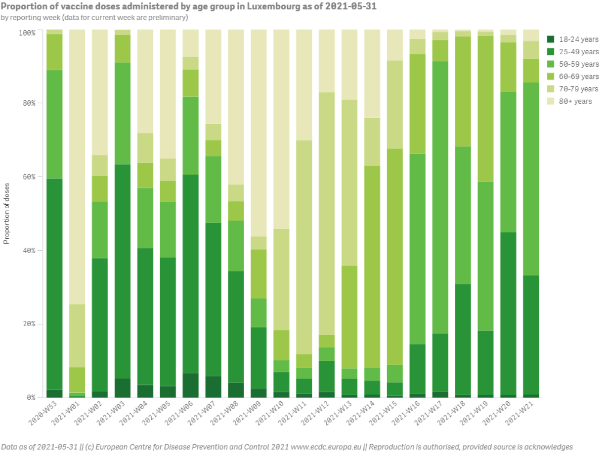 In week 21 of 2021 (24 May-31 May), 52% of those that received jabs were between 50-59 years old, 32% between 25-49, 6% between 60-69, and 8% above 70. 2% was administered to people below 25.