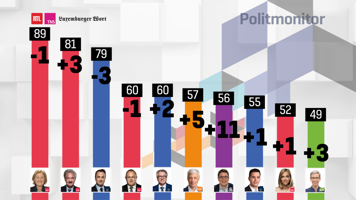 A total of 35 political figures are scrutinised in the areas of sympathy, competence and familiarity. The survey was conducted on behalf of RTL and Luxemburger Wort by TNS Ilres, and included 1,127 representative respondents.