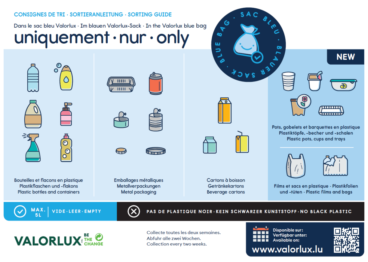 In concrete terms, this means that in addition to the usual packaging, plastic bottles, metal packaging and beverage cartons, households will also be able to dispose of plastic pots, cups, trays, as well as plastic films and bags using the Valorlux blue bag.