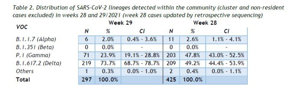 However, the Delta variant is on the rise, reflecting a trend which began some weeks ago. It remains the dominant mutation of the virus in Luxembourg, accounting for 73.7% of sequenced samples, while the Gamma variant lies in second place with 23.9% of infections.