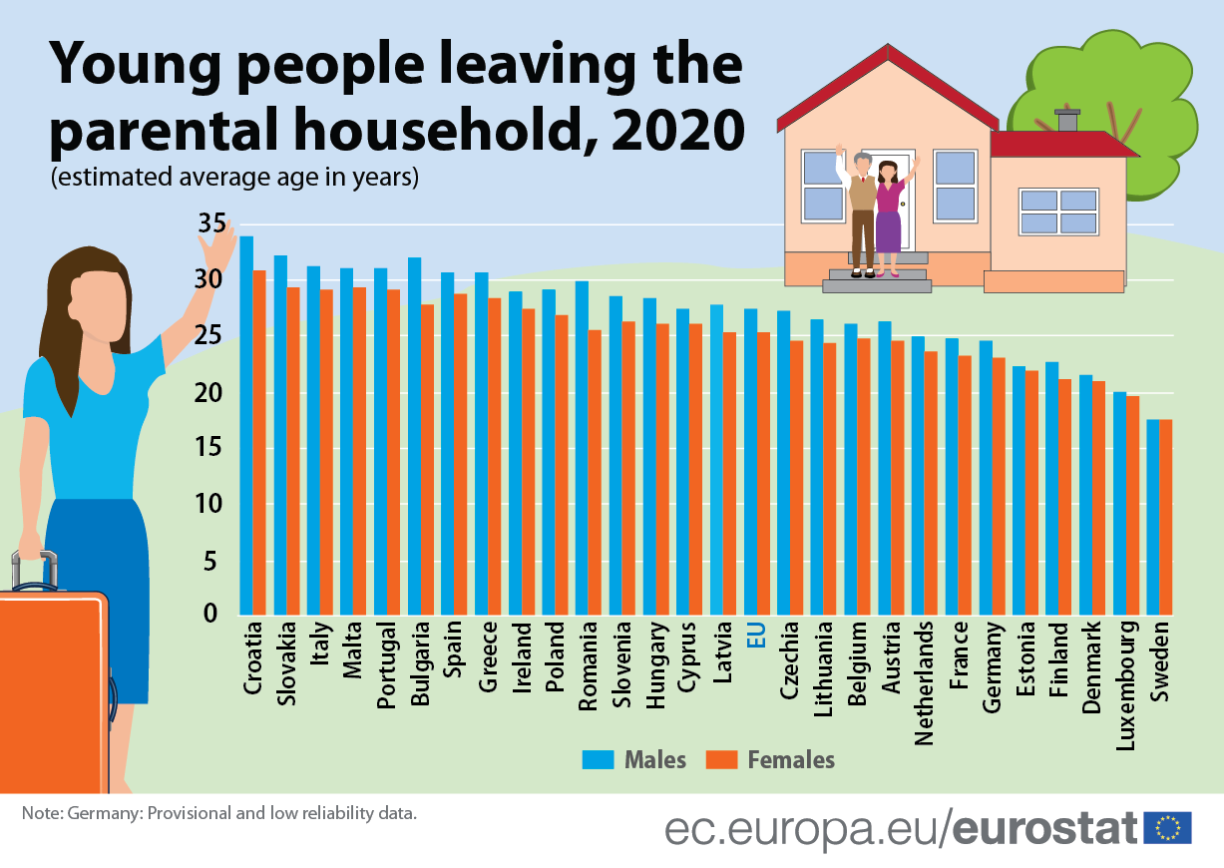 In 2020, across the EU, young people left their parental household on average at the age of 26.4 years. However, the average varies strongly among different Member States.