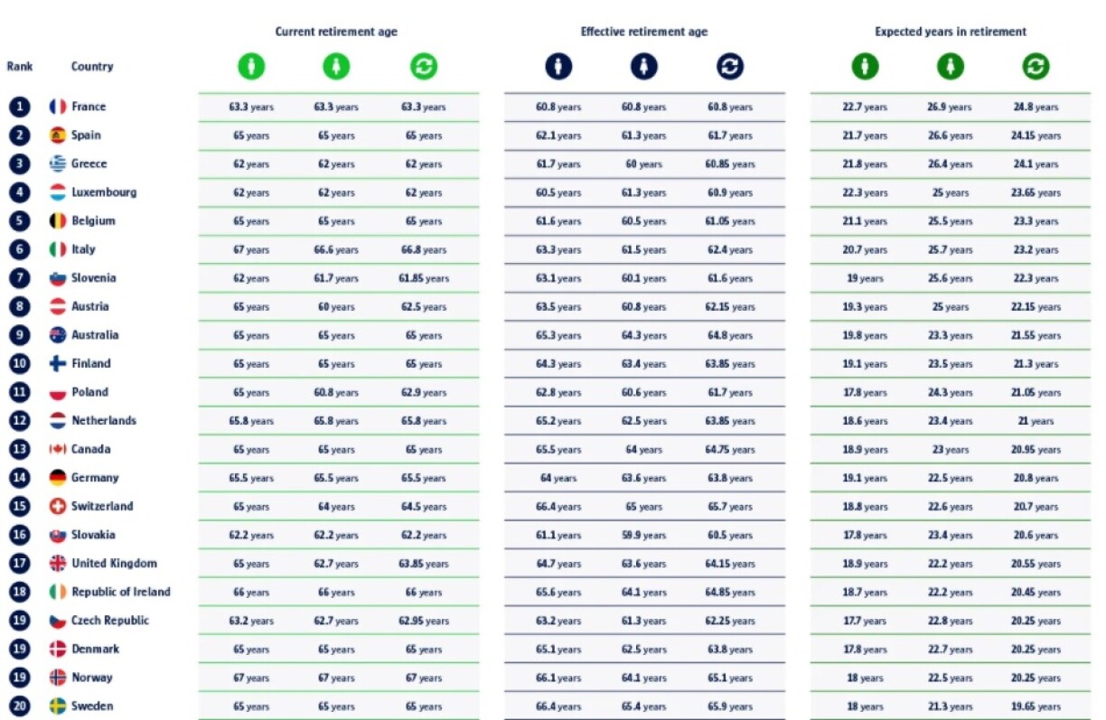 Table leaders France average 24.8 years of retirement, followed by Spain with 24.15 years, and Greece with 24.1 years. Belgium comes in fifth behind the Grand Duchy with an average retirement period of 23.3 years. Neighbouring country Germany ranks 14th with an average of 20.8 years of retirement.