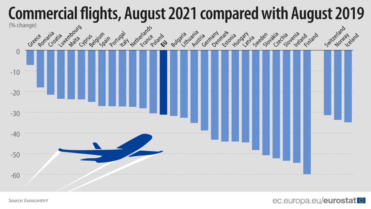 In total, across the bloc, the number of commercial flights stood at 479,000 in August 2021, compared with 325,000 in August 2020 and 696,000 in August 2019.