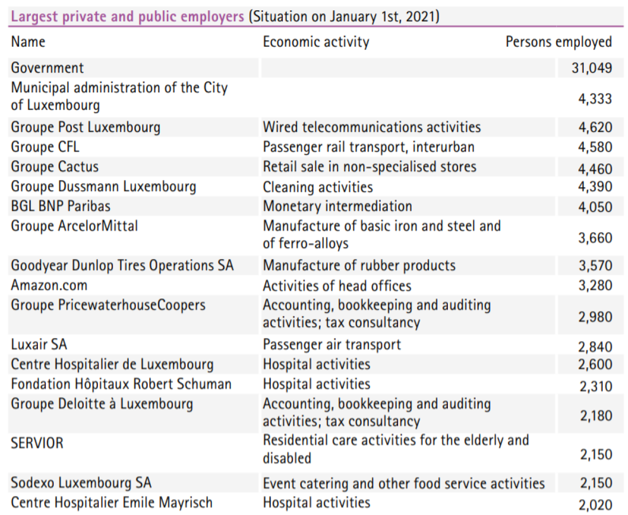 The government and civil service still represent the largest employer in the country, with 31,049 employees. Post Luxembourg has 4,620 employees, CFL has 4,580 and Cactus supermarkets employ around 4,460 people. They’re followed by Dussmann with 4,390 and BGL BNP Paribas with 4,050 employees.
