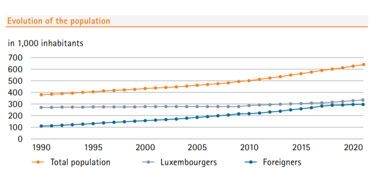 As of 1 January 2021, 634,700 people were resident in the Grand Duchy, 47.2% of whom are not Luxembourgish by birth. In 2011, this figure was 43%; in 2001, it was 36.9%.