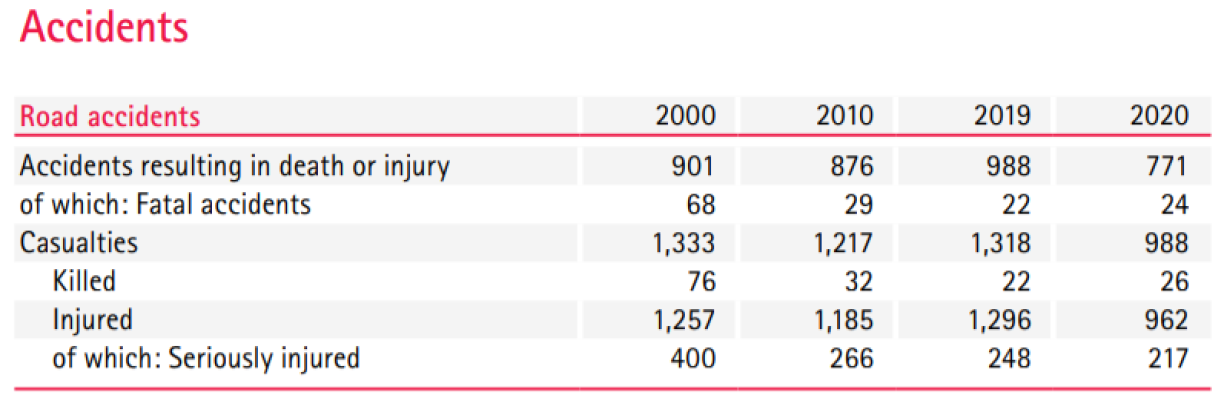 The number of people injured in accidents dropped significantly from 988 to 771 from 2019 to 2020. However, four more people lost their lives in an accident in 2020, compared to the 2019 figures.