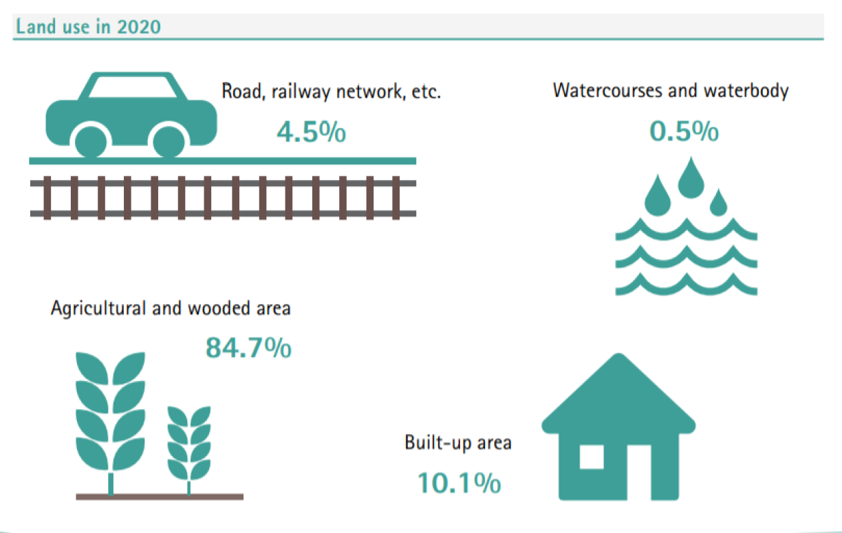 In 2020, 84.7% of Luxembourg’s territory was used for agriculture or forests, while 10.1% consisted of built up areas. 4.5% of the land is used for roads or railways.