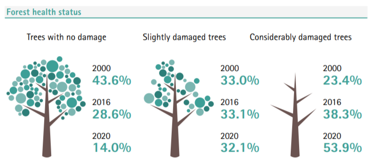 Luxembourg’s forests are under threat, according to the report. 53.9% of trees are considerably damaged, compared to 23.4% in 2000. Just 14% of the Grand Duchy’s trees are said to be in good condition.