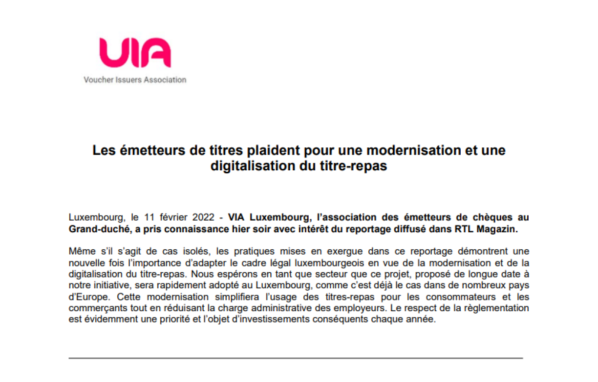 The Voucher Issuers Association (VIA) Luxembourg, which represents the companies Sodexo and Edenred, who sell the vouchers, also responded to RTL’s undercover report. VIA said the report highlighted the significance of reviewing the existing legal framework and the need to adapt to the digitisation of the vouchers.