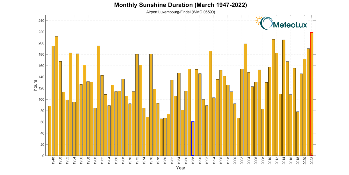 In March 2022, more sunshine was registered than during any previous March since the beginning of records in 1947. The meteorological station at Findel airport measured 218.8 hours of sunshine over the course of the month.