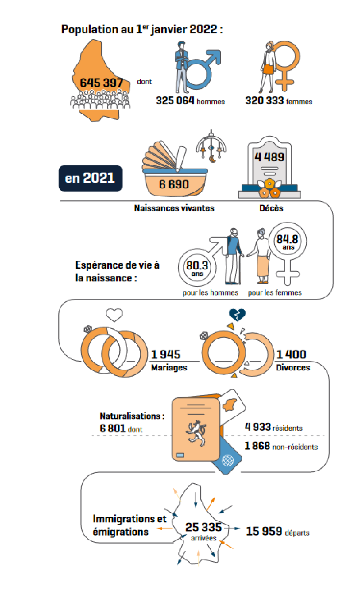 On 1 January 2022, 645,397 people lived in Luxembourg. This means that population growth since 1 January the previous year was 1.7%, the same rate it used to be before the pandemic.