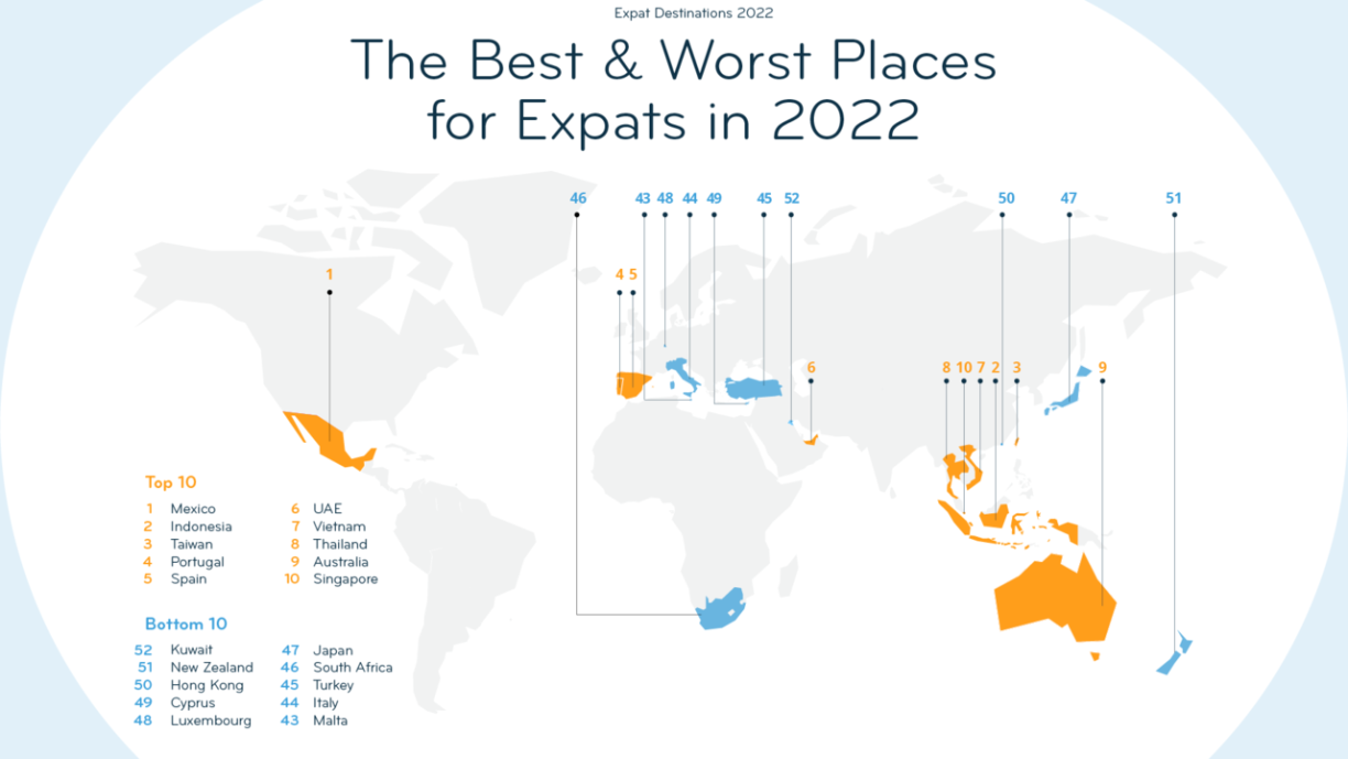 According to the survey, the top five countries rated by expats are Spain, Portugal, Taiwan, Indonesia, and Mexico, which tops the list.