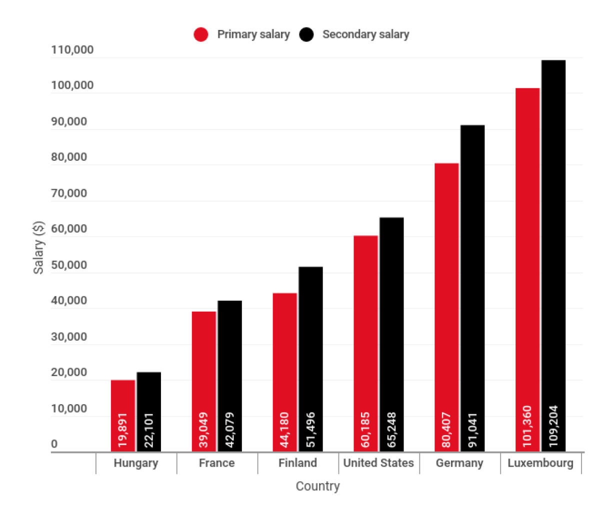 Even for new starters, however, Luxembourg’s teacher salaries buck the trend. Primary teachers can expect around €68,000 ($69,425) at the beginning of their career, with secondary teachers earning over €77,000 ($78,681) from the start.
