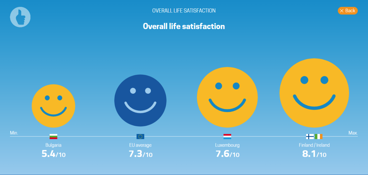 Here, Luxembourgers scored 7.8/10, just below the average of 7.9. Many populations even scored as high as 8.6, including Austria, Ireland, Malta, and Slovenia.