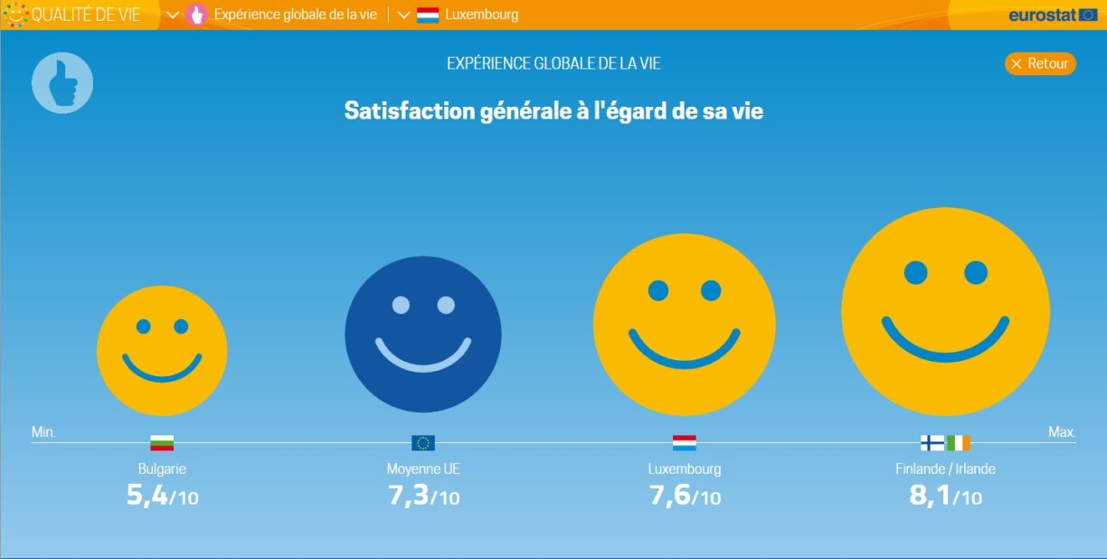 In the category ‘overall life satisfaction’, Luxembourgers recorded a score of 7.6/10. This is above EU average (7.3) and only below Finland and Ireland (both 8.1).