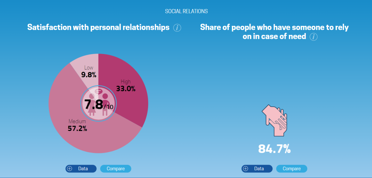 The only part of the survey where Luxembourg ranks below EU average is in the category of social relations. Two factors were considered, the first of which was satisfaction over personal relationships.