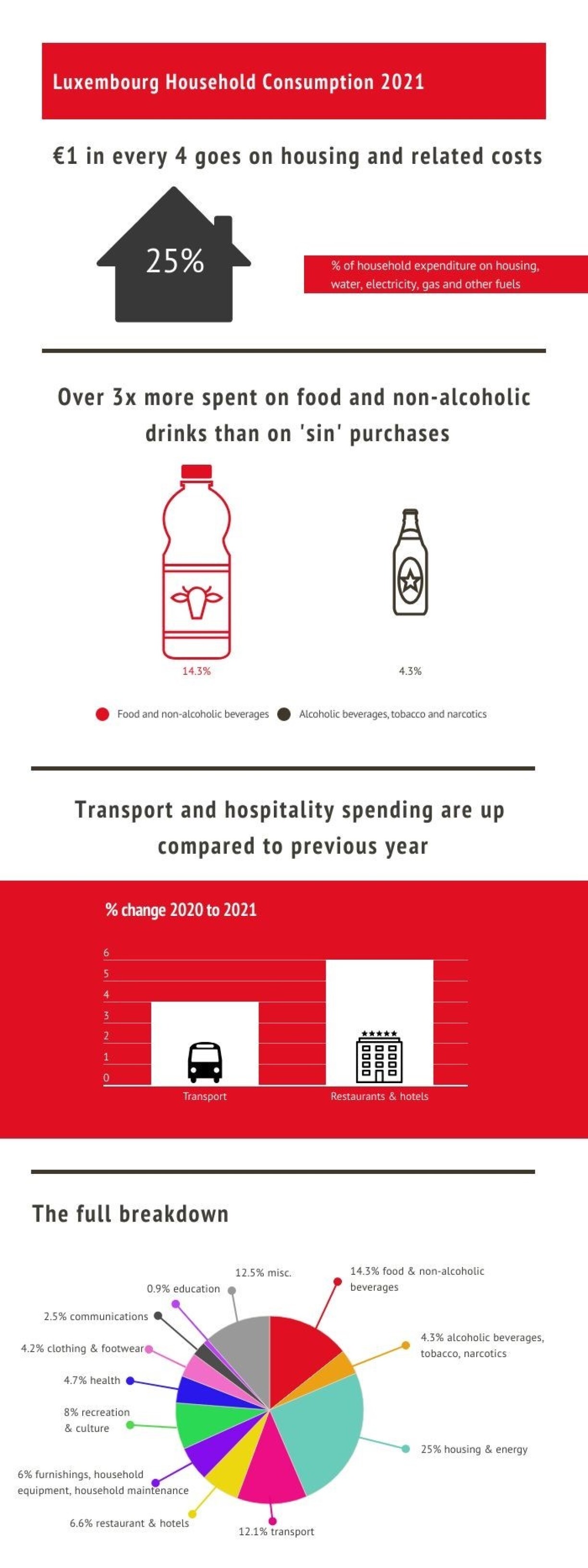 Across the EU, the top spending categories were similar to Luxembourg: housing-related costs, followed by food and non-alcoholic beverages, then miscellaneous expenditure and transport.