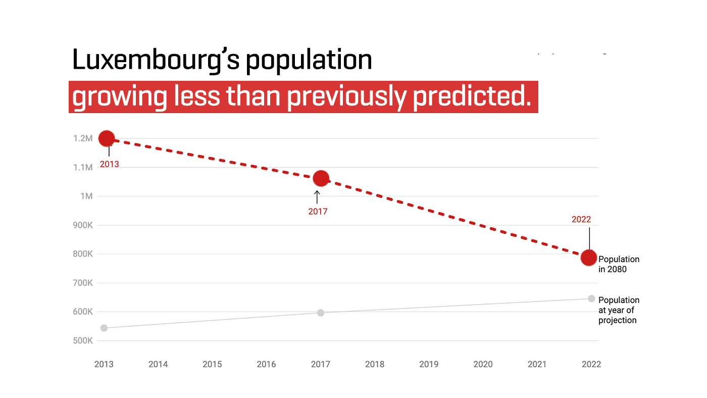 However, if you were to compare Luxembourg’s population projections for 2080 from Eurostat’s 2013 and 2017 projections, you would notice that the growth forecast has been consecutively slashed.