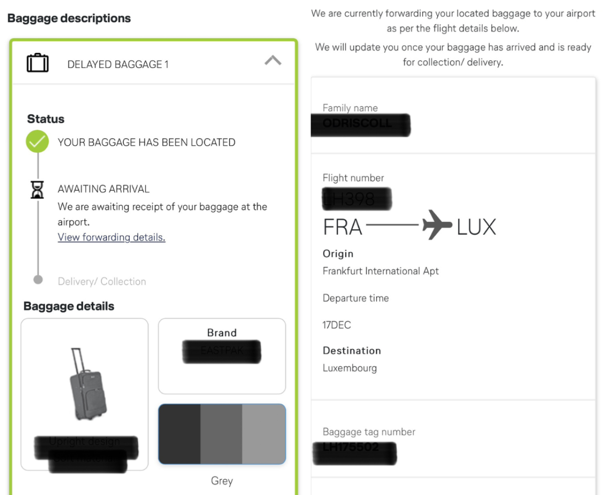 Staff on the Lufthansa flight were aware of the situation and had updated passengers mid-air that, despite finally arriving with a delay, there were no bags onboard. “Everyone was a bit fed up but were still glad we got to Luxembourg,” says Abigail.