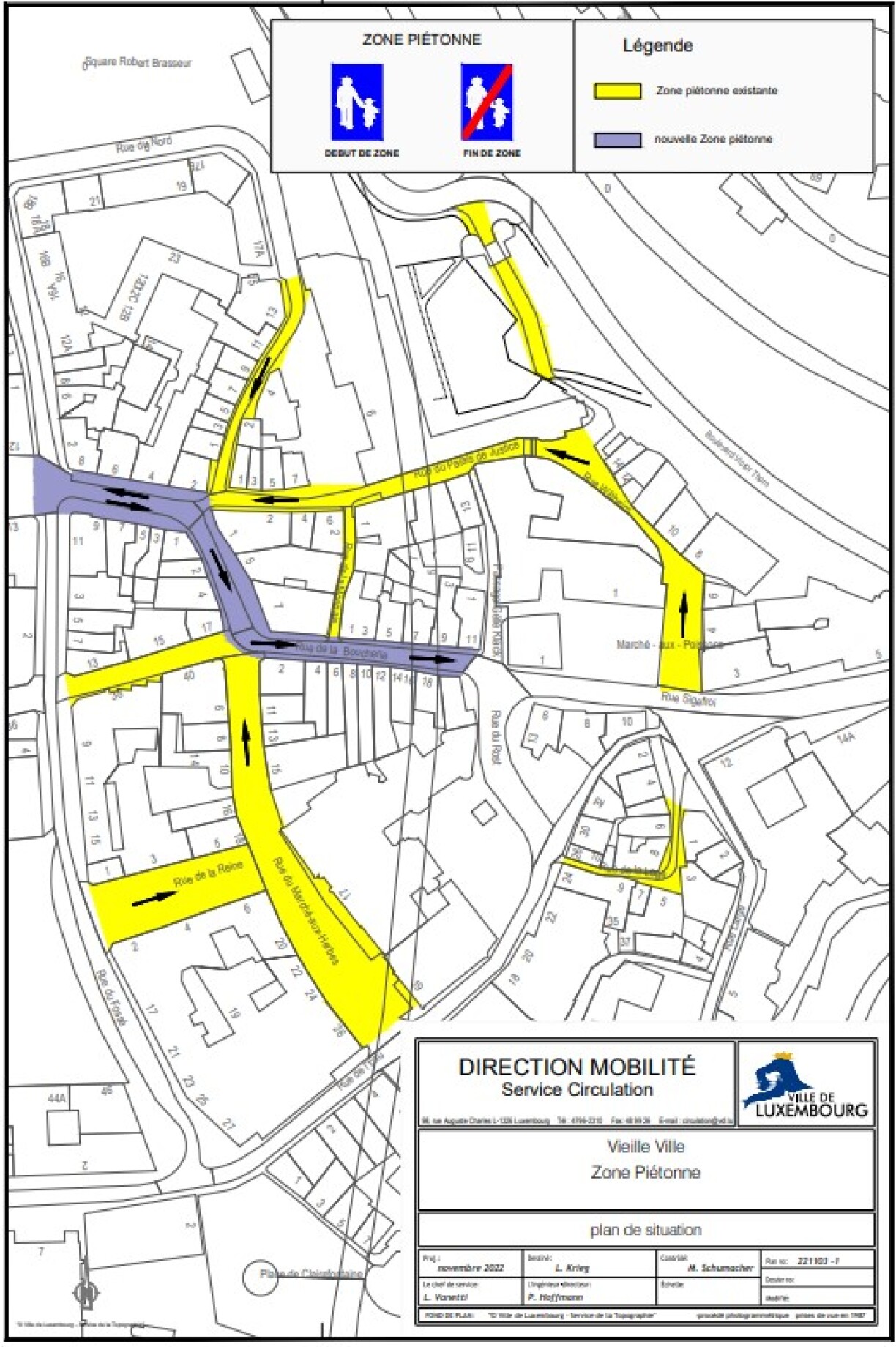 The areas of rue de la Boucherie, the part of rue du Marché-aux-Herbes located between the Grand-Rue and the rue de la Boucherie as well as the section of the Grand-Rue situated between the rue du Nord and the rue du Fossé will be closed to passing traffic from 9 January onward.