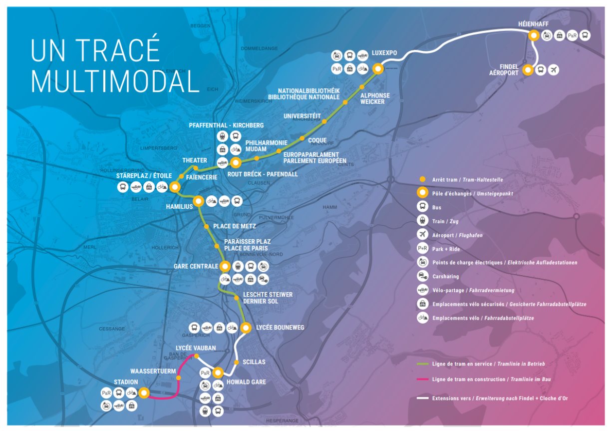 The development of Luxembourg City’s tram project is edging ever closer to its ultimate goal: the completion of sections D (Bonnevoie-Cloche d’Or) and E (Luxexpo-Findel). Passengers will then be able to travel from Cloche d’Or to Findel airport by tram and vice versa.