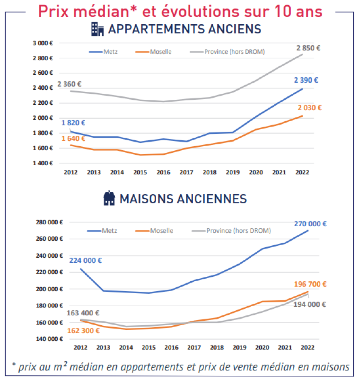 Overall, the square-metre price in the Moselle department has increased by 5.6% between 2021 and 2022. The median price of an old house is currently at around €200,000 in the Grand Est department. In Metz, the median price is around €270,000. For old flats, the square-metre price is around €2,000, compared to €2,400 in Metz.