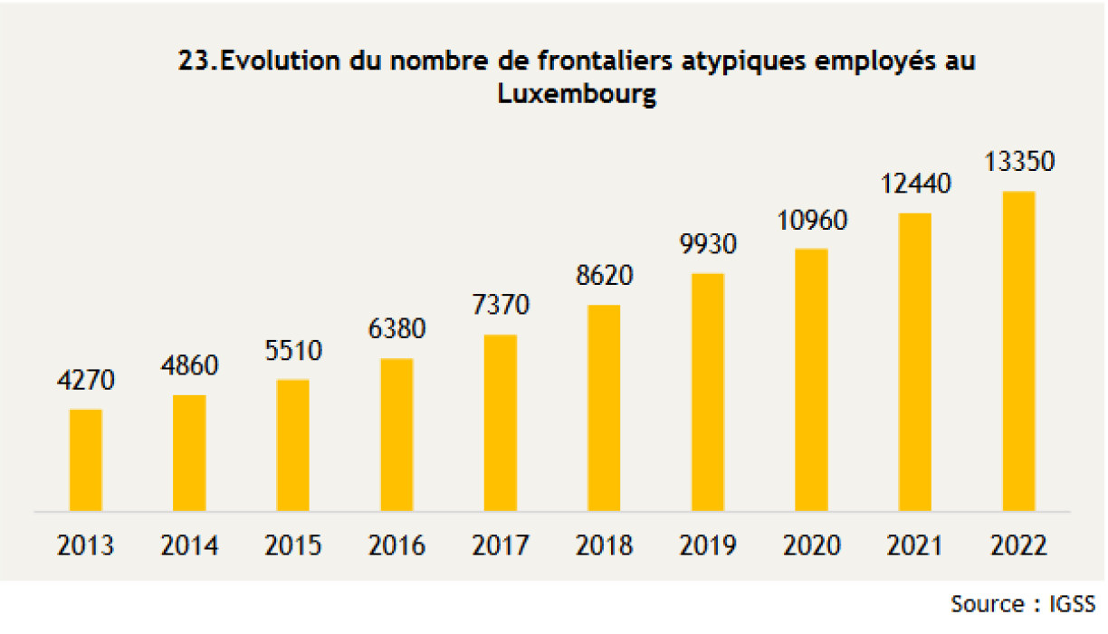 Once marginal, these Luxembourgish cross-border commuters are beginning to make their presence felt and figures unveiled by the Idea Foundation bear witness to this trend: “Between 2017 and 2022, 70% of the 67,900 new employees in Luxembourg are of foreign nationality (45% are foreign cross-border commuters and 25% are foreign residents), and only 30% have the Luxembourgish nationality (21% residents and 9% cross-border commuters). Over the last five years, almost one in ten new employees (9% or roughly 6,100 of the 67,900 new employees) is therefore a cross-border commuter of Luxembourgish nationality, which brings that number to a total of 13,350 people.”