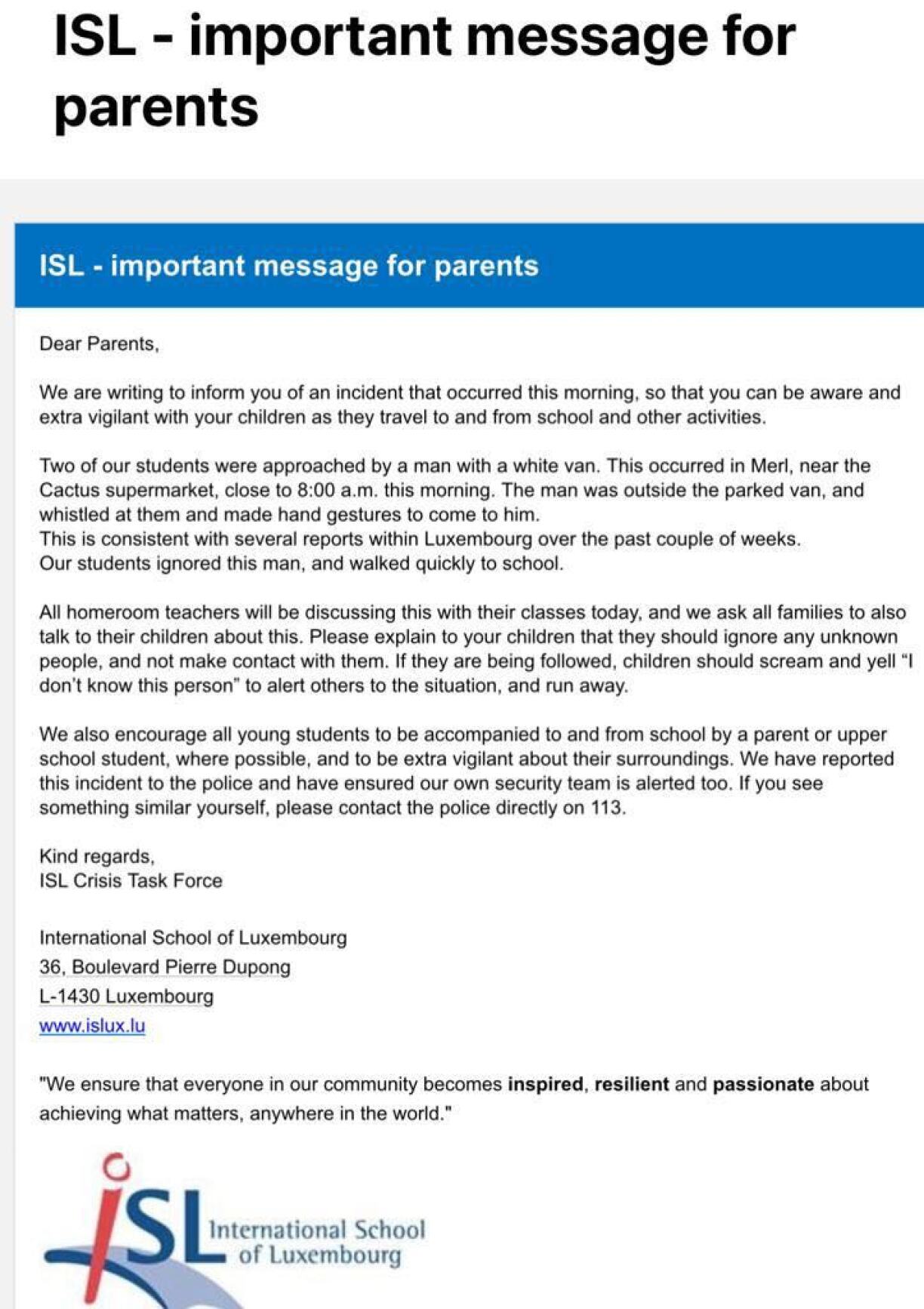 The ISL has since reported the incident to the authorities and advised parents to warn their children. Furthermore, teachers will address the issue in class. As far as pupils are concerned, the school suggests that the youngest pupils should always be accompanied by a parent or older student when going to or leaving the school.