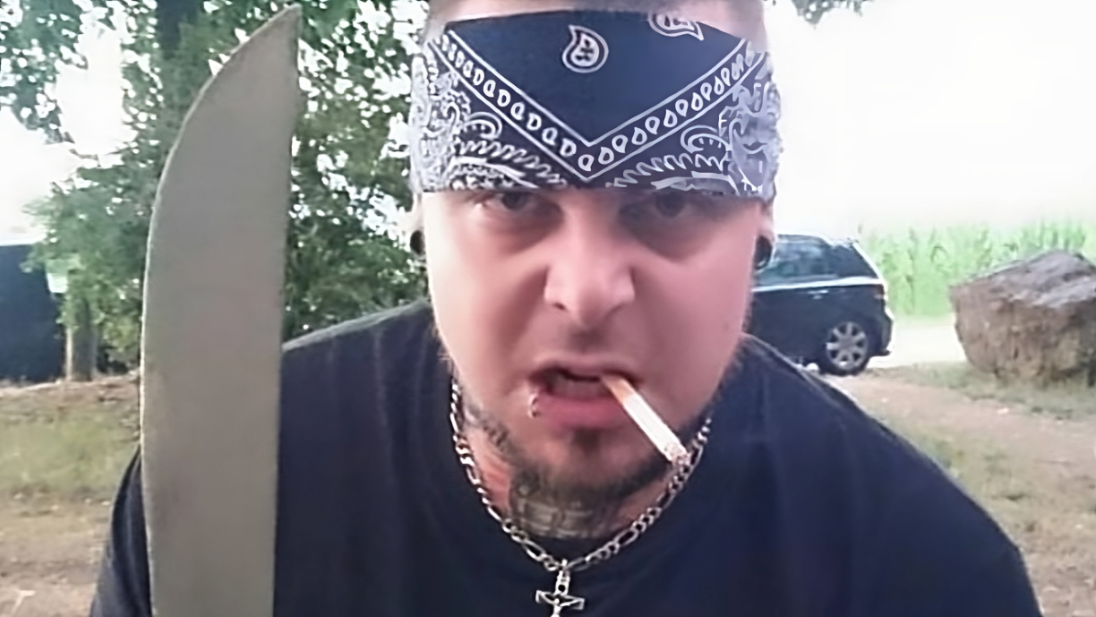 In another photo posted on Vossen’s account, he can be seen wearing a T-shirt featuring the logo of the Nazi rock band “Screwdriver.” Known for their deeply racist lyrics and calls for violence, “Screwdriver” is associated with the right-wing radical network “Blood and Honour,” banned in Germany since 2000. The photo further depicts Vossen holding a machete.