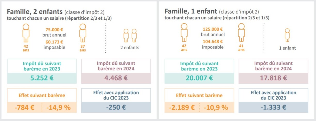 A family with one child and a gross annual salary of 45,000 (partner 1) plus 36,000 euros (partner 2) would have 645 euros more net. A single parent with one child earning 50,000 euros would have 755 euros more net.