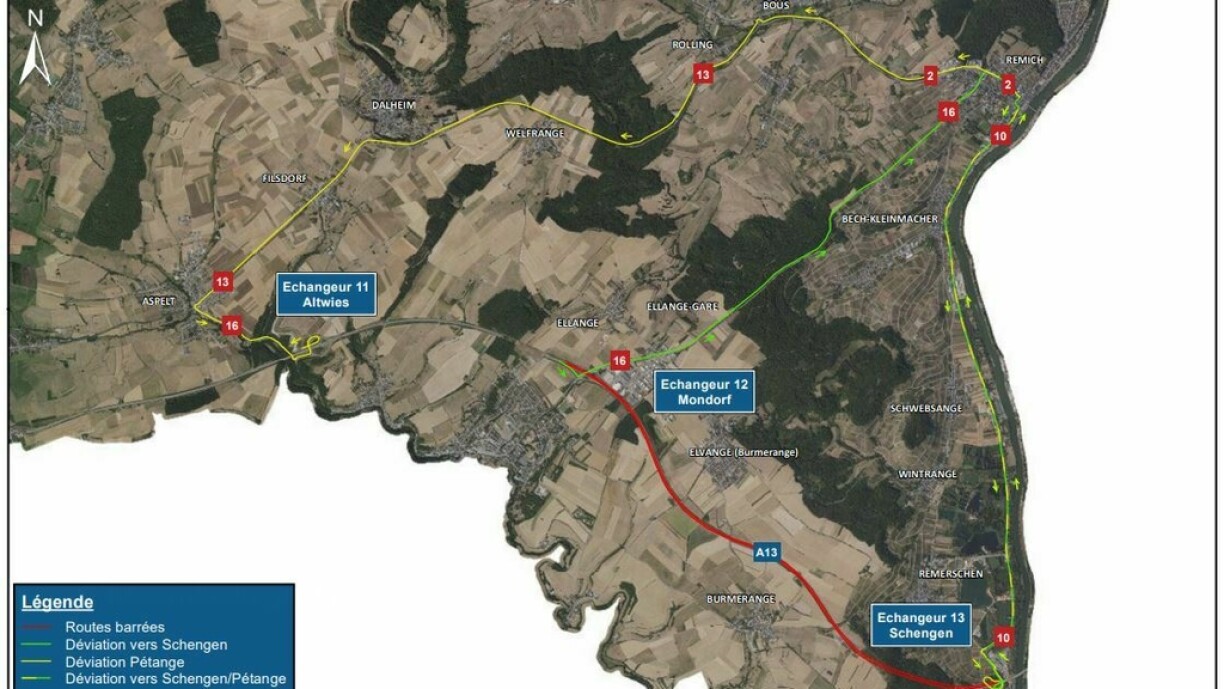 Traffic will be diverted via the Mondorf interchange, the N16, the N2, the N10 and the Schengen interchange for all motorists travelling from Germany. Traffic going in the other direction from the A13 towards Pétange will be diverted via the Schengen interchange, the N10, the N2, the N13 and the Hellange interchange.