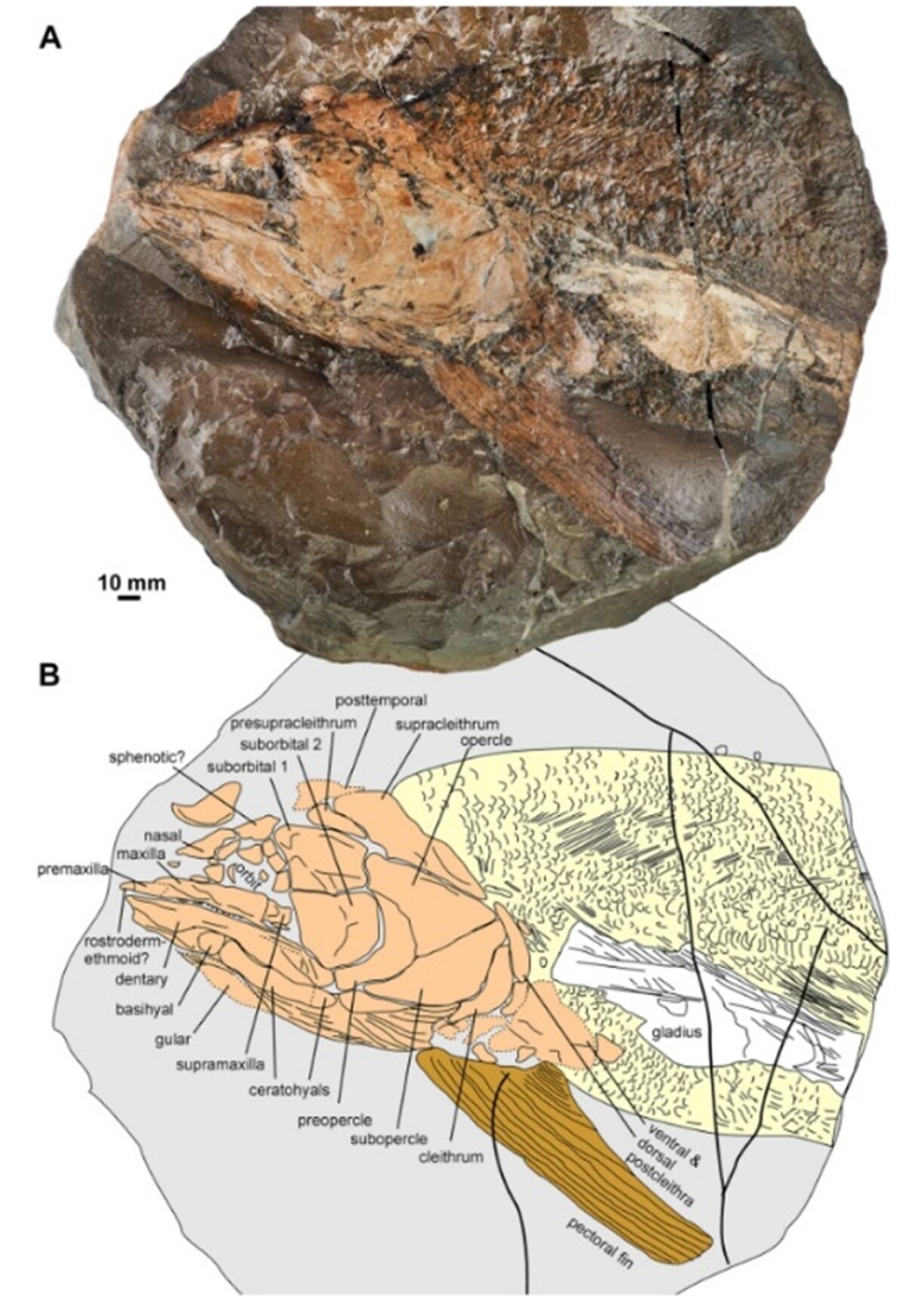 In addition to the fossil’s nearly 40-centimetre long skeleton and the food remains within, residues of fossilised ink were also found in the skeleton.