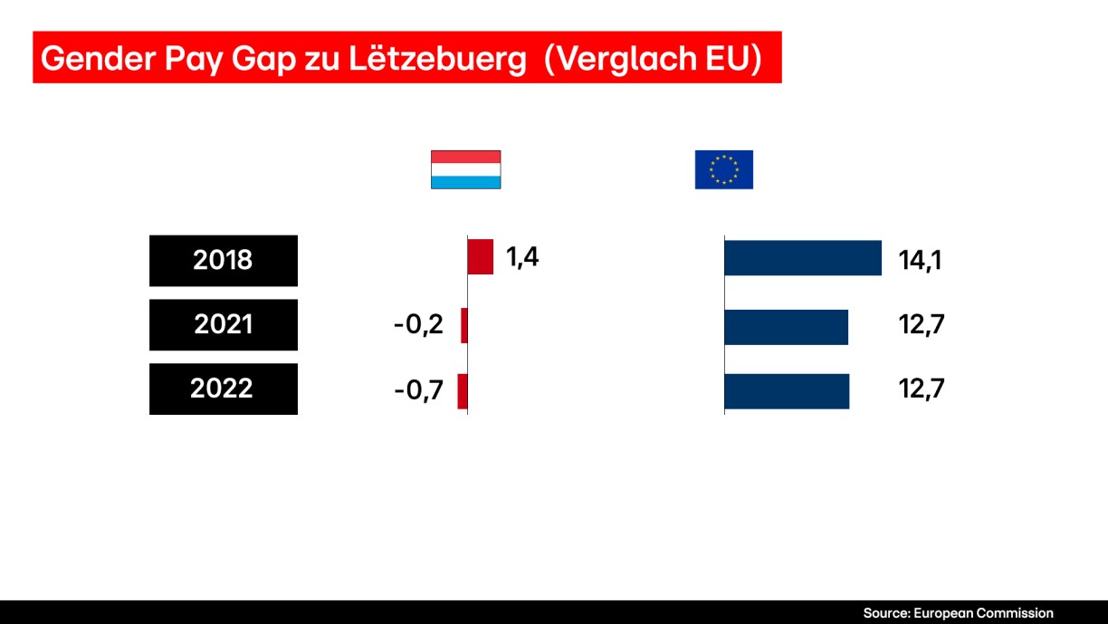 In 2021, Luxembourg witnessed a historic moment as the gender pay gap, i.e., the difference between the average hourly wage for women and men, turned negative for the first time, registering at -0.2%. According to the latest STATEC data, this gap widened further in favour of women in 2022, reaching -0.7%.