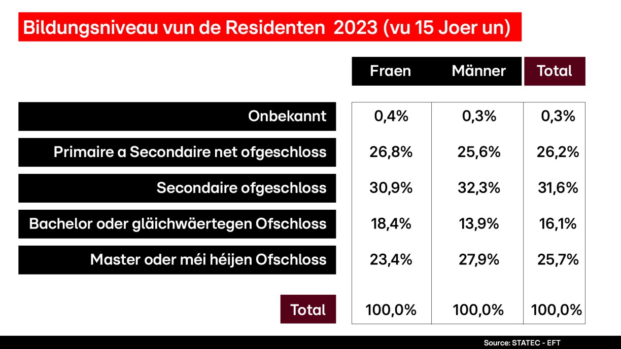In terms of education, while women outnumber men in bachelor’s or equivalent degrees (18.4% compared to 13.9%), men lead in master’s or higher degrees (27.9% compared to 23.4%). Additionally, women remain underrepresented in management positions, accounting for only 38% of all employees in such roles as of 2018, according to the latest STATEC data.