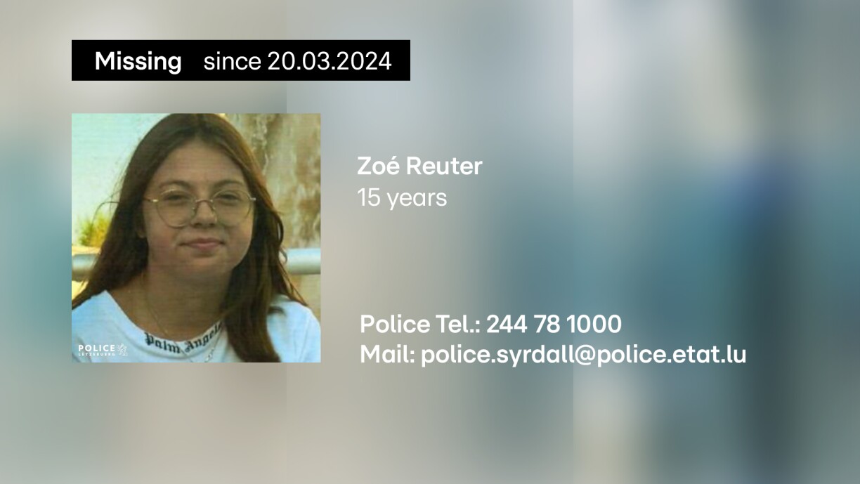 Zoé Reuter is described as being between 1.60 and 1.70m tall, with shoulder-length brown hair. She wears glasses. At the time of her disappearance, she was wearing black jogging bottoms, a white jumper and black trainers. Police say she has links to the Gare district in Luxembourg City and could be staying in the area.