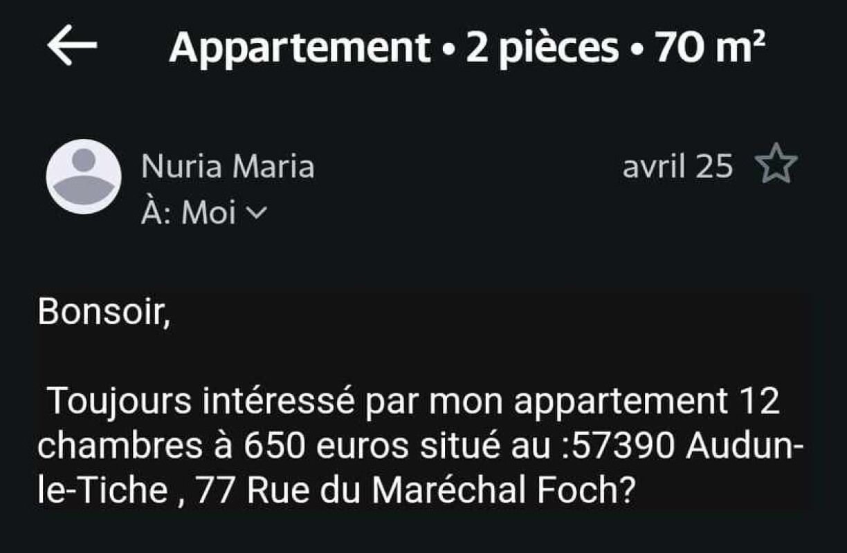 A few days later, they received a rather bewildering reply (see below) from a certain “Nuria Maria": “Are you still interested in my 12-room flat at €650?” 12 rooms, no less... Our colleagues replied that yes, they were still interested. But since then, total silence from the scammer. It has to be said that, in the meantime, the ad site SeLoger.com had taken action. The site informed our colleagues by email that the ad was “immediately withdrawn” because of “fraudulent behaviour.”