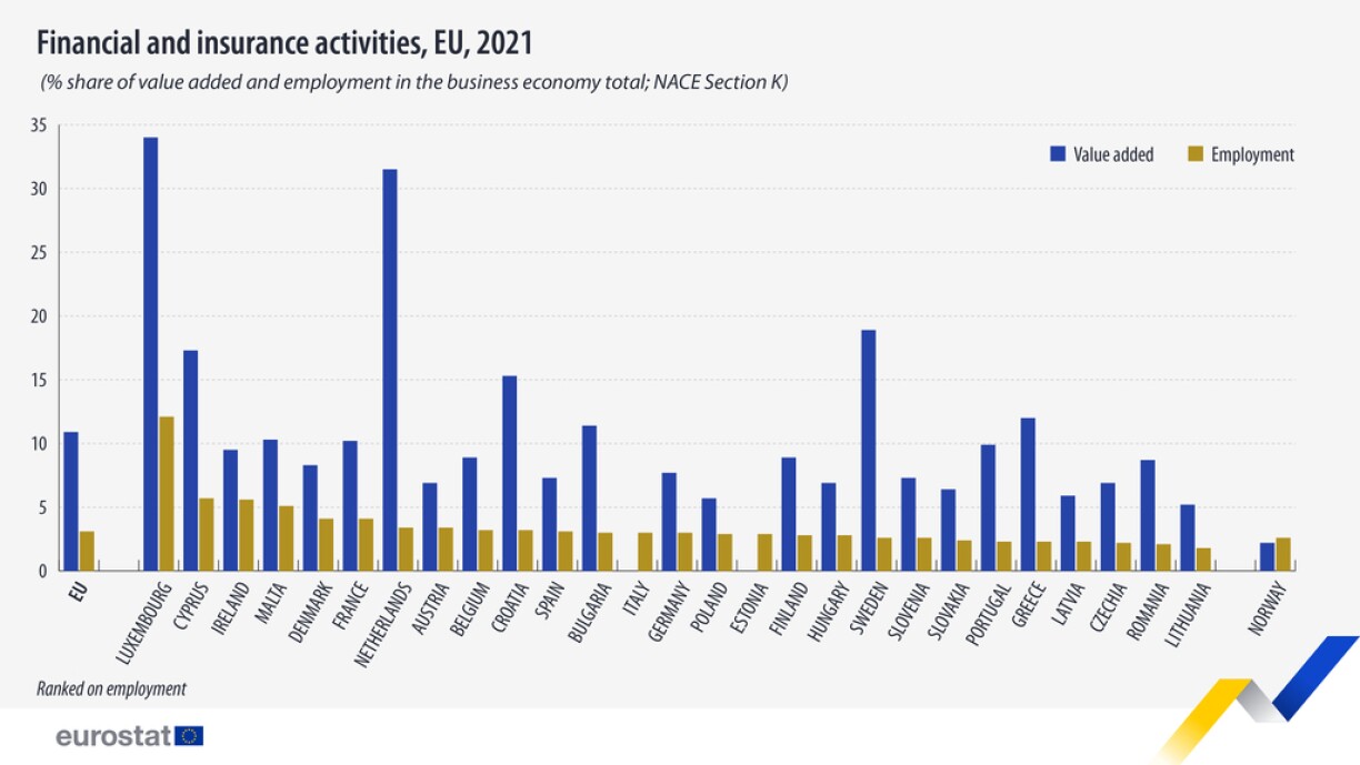 According to a new Eurostat report, Luxembourg emerged as a notable player in the European Union’s financial and insurance activities sector in 2021, boasting the highest employment share with 12.1% of the country’s business economy workforce engaged in financial and insurance activities. Luxembourg also led in terms of value added, with 34% of the country’s business economy value generated by this sector.
